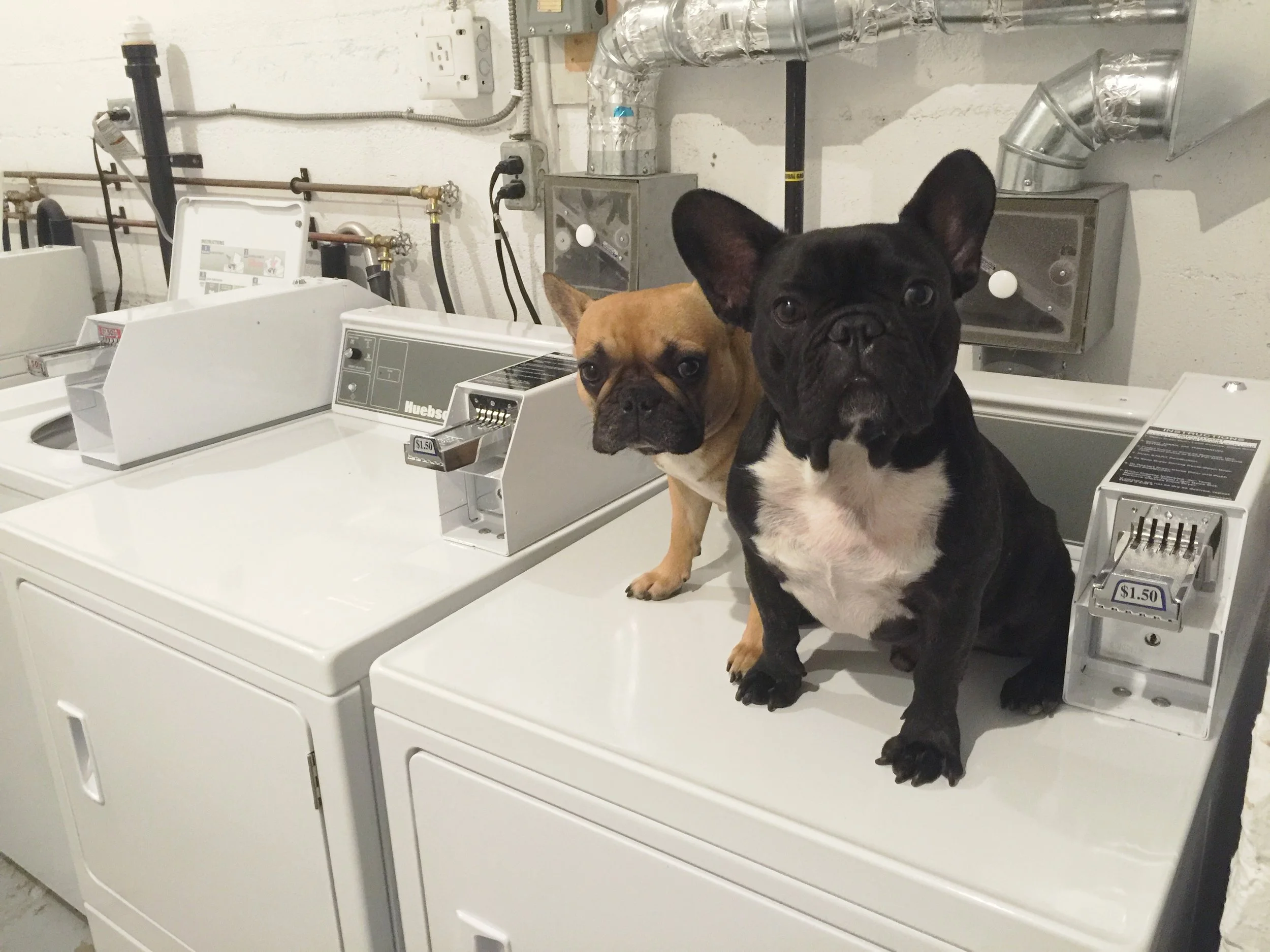 Well, the Shankshgiving holidaytimes are all over, so now is the times for doing lotsa squeakycleanings in our 'partmenthouse!! Yup!! That is why me plus Mirabelle are here in the caves under where we live, hanging out with the washmanaut robots!! Yup!! Everythings is in their bellies getting all shinynew a 'gain!! ...............................